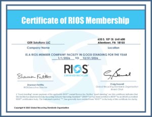 R2v3 Certified – we completed & passed our audit the week of February 2022 – new certificate, valid through February 2025, featured below! We undergo a surveillance audit annually and a recertification audit every 3 years. Please contact me with any questions – 610.443.1776 or jjohnson@gersolutions.netSERI [R2} websiteR2v3 Certificate R2 is the standard for Responsible Recycling. R2 standards are set by the local and federal governments. Any/all electronic recycler that becomes R2 Certified go through phases of Audits. R2 has set of processes, safety measures and documentation process that R2 Certified companies must abide by. This practice also permits us to do the following: Dismantling | RIOS CertifiedWhat does RIOS mean? RIOS stands for Recycling Industry Operating Standard. It focuses on the following aspects: See Our Name on the RIOS list! This is a certification that is designed by recyclers for recyclers. By combining the listed systems, electronic recyclers such as GER Solutions, LLC can then better manage them. See below for a link to our certification which is valid through February 2025. GER Solutions LLC RIOS Certificate ![]() |